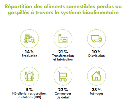 Le gaspillage alimentaire se définit par toute partie comestible d’un aliment destiné à la consommation humaine qui est détournée, dégradée, perdue ou jetée à n’importe quelle étape du système bioalimentaire, incluant celles de la récupération et redistribution alimentaire et des consommateurs.